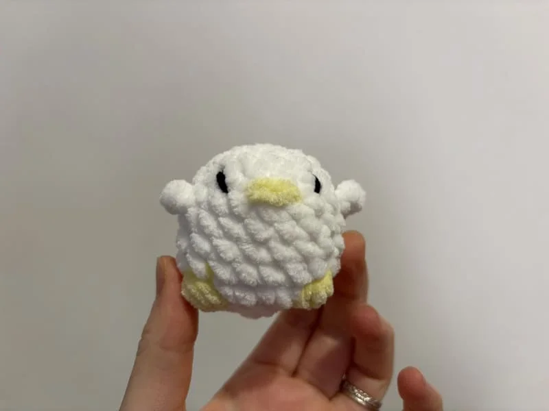 Ce mini poussin en crochet se distingue par sa forme toute ronde qui lui donne l’apparence d’une petite boule pleine de tendresse. Ses yeux brodés noirs et son bec jaune également brodé lui apportent une expression douce et attachante.